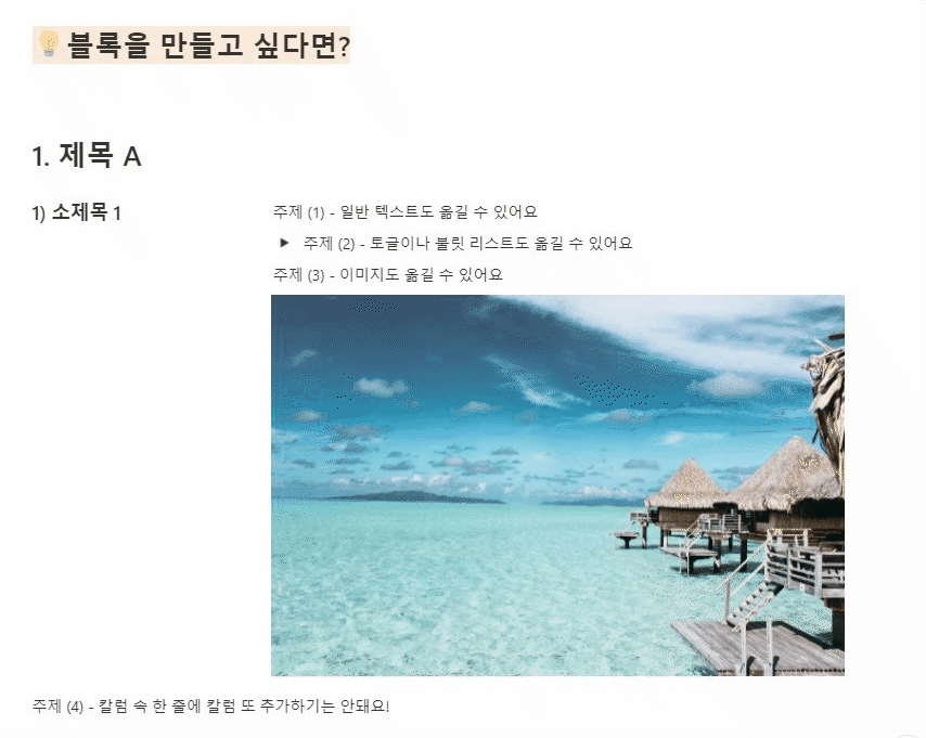 텍스트는 물론이고, 토글이나 불렛 리스트 등 모든 블록으로 단을 나눌 수 있다.