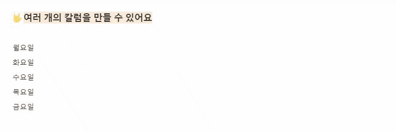 보통 칼럼을 만들 때는 2단으로 사용하거나, 위클리 페이지를 만들 때 4~5단 정도 사용하는데 노션에서는 그 이상도 만들 수 있다.